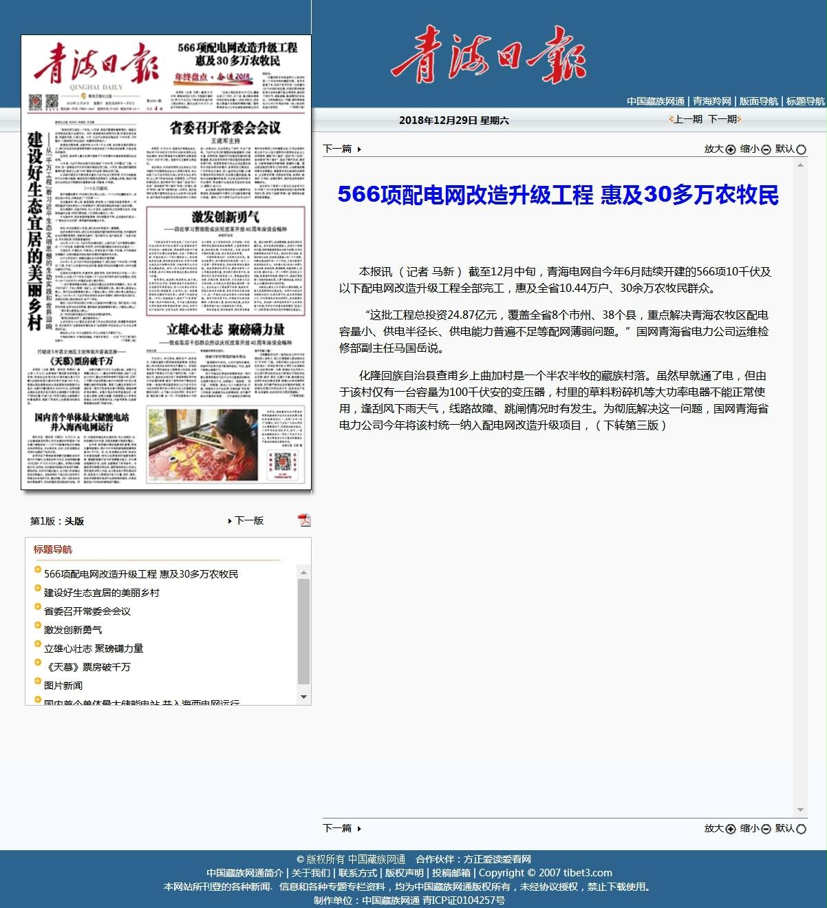 《青海日报》:566项配电网改造升级工程 惠及30多万农牧民